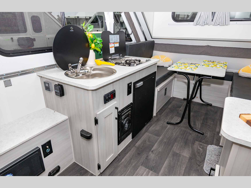 Sleeps 3 Length 15 ft Ext Width 6 ft 6 in Ext Height 5 ft 4 in Hitch Weight 160 lbs GVWR 3000 lbs Dry Weight 1725 lbs Fresh Water Capacity 11 gals Tire Size 14" Furnace BTU 18000 btu Refrigerator Type 12V Refrigerator Size 3.2 cu ft Cooktop Burners 2 Axle Count 1 -