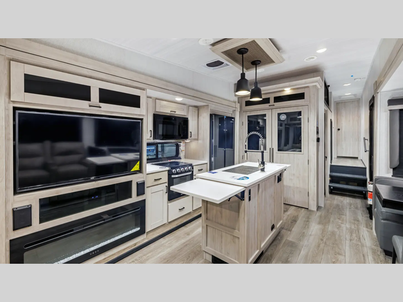 Sleeps 4 Slides 3 Length 40 ft 10 in Ext Width 8 ft Ext Height 13 ft 4 in Hitch Weight 2120 lbs GVWR 16120 lbs Dry Weight 12619 lbs Cargo Capacity 3501 lbs Fresh Water Capacity 64 gals Grey Water Capacity 108 gals Black Water Capacity 44 gals Furnace BTU 35000 btu Available Beds King Refrigerator Type 12V Refrigerator Size 16 cu ft Cooktop Burners 4 Number of Awnings 2 LP Tank Capacity 30 Lbs. Water Heater Type On Demand Tankless AC BTU 27000 btu TV Info 65" LR TV Awning Info 14' & 18' Power Awnings w/ LED Lights Axle Count 2 Washer/Dryer Available Yes Number of LP Tanks 2 Shower Type Standard Electrical Service 50 amp Similar Floorplans