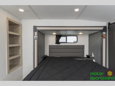 Wow! You won't believe the features found in this luxury fifth wheel that can sleep up to nine each night! Your guests or the kids will absolutely love the middle bunkroom with a hide-a-bed sofa and bunk beds plus a loft above for even more sleeping or storage space. There is also a desk/wardrobe here, which will allow you to utilize this space as an office as well! You'll have your own space in the front private bedroom on the king bed slide out, and there is a walk-in wardrobe to keep your clothes tidy. There is even washer and dryer prep for the option to keep those clothes clean! The chef of your group will have everything they need to prepare meals, including a 21" 2-in-1 oven range, an over-the-range microwave, a 16 cu. ft. 12V refrigerator, plus a kitchen island for more counter space. In the evenings, your crew can get cozy on the rear sofa and theater seats across from the entertainment center and fireplace, or you might just play a game at the hi-top table and chairs!