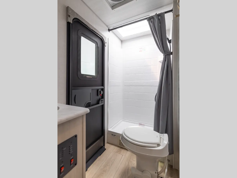 These travel trailers are extended season ready with a 2" aluminum framed floor and block foam insulation, plus there is a sealed underbelly with forced heat and radiant foil insulation. You'll love the Surf(X) seamless countertops throughout, and there is a tankless water heater for endless hot showers. Outside, a power tongue jack is ultra convenient and there is a hot and cold spray port to wash off hiking gear!
