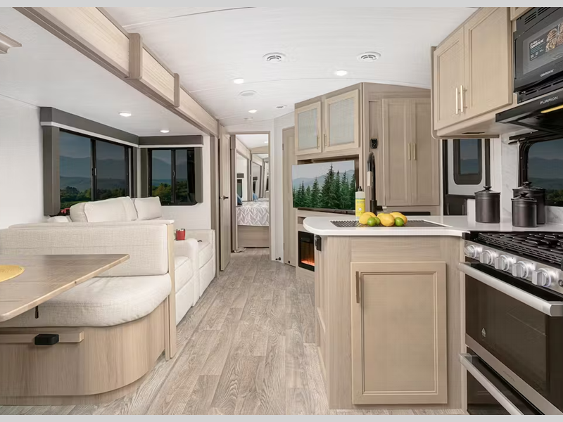 Sleeps 8 Slides 2 Length 37 ft 5 in Ext Height 11 ft 4 in Int Height 6 ft 6 in Interior Color Stone, Tobacco Exterior Color Royal Gold, Obsidian Hitch Weight 1055 lbs Dry Weight 8220 lbs Cargo Capacity 2280 lbs Fresh Water Capacity 54 gals Grey Water Capacity 76 gals Black Water Capacity 38 gals Tire Size ST225/75R15E Furnace BTU 35000 btu Number Of Bunks 2 Available Beds King Refrigerator Type 12V GE Refrigerator Size 10 cu ft Cooktop Burners 3 Shower Size 30" x 40" Number of Awnings 1 Axle Weight 5100 lbs Garage Size 6 ft 10 in LP Tank Capacity 30 lbs Water Heater Type On Demand AC BTU 15000 btu TV Info LR 50" HDTV Awning Info Power Lighted w/Adjustable Arms Axle Count 2 Number of LP Tanks 2 Shower Type Standard Electrical Service 50 amp Similar Floorplans