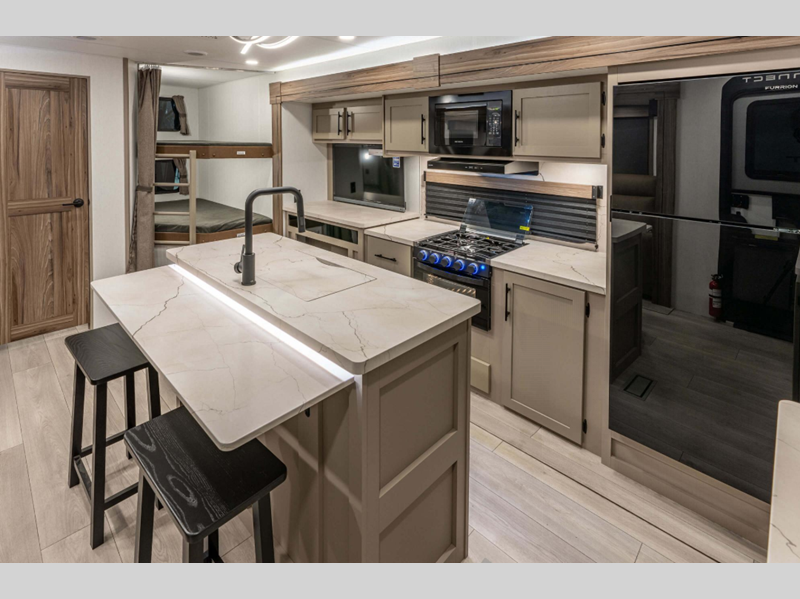 Sleeps 5 Slides 2 Length 31 ft 11 in Ext Width 8 ft Ext Height 11 ft 4 in Int Height 6 ft 10 in Interior Color Nomad Hitch Weight 810 lbs GVWR 8800 lbs Dry Weight 7170 lbs Cargo Capacity 1630 lbs Fresh Water Capacity 45 gals Grey Water Capacity 32 gals Black Water Capacity 32 gals Tire Size 15" Furnace BTU 30000 btu Available Beds King Refrigerator Type 12V Refrigerator Size 10 cu ft Cooktop Burners 3 Number of Awnings 1 Axle Weight 6360 lbs LP Tank Capacity 20 lbs Water Heater Type On Demand Tankless AC BTU 13500 btu TV Info LR LED TV Awning Info 19' Electric with LED Lights Axle Count 2 Number of LP Tanks 2 Shower Type Radius Electrical Service 50 amp Similar Floorplans