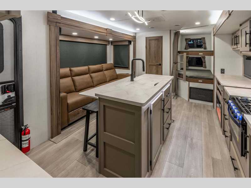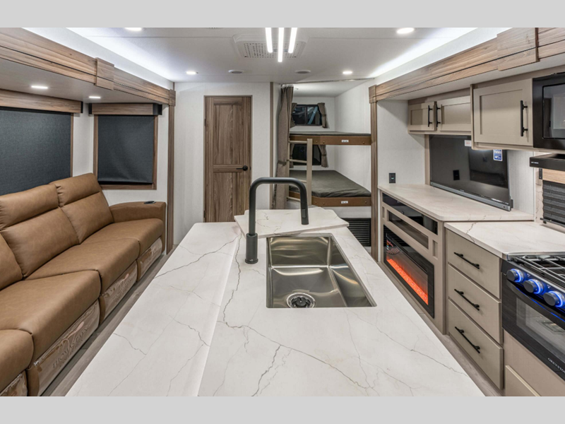 Sleeps 7 Slides 2 Length 35 ft 8 in Ext Width 8 ft Ext Height 11 ft 4 in Int Height 6 ft 10 in Interior Color Nomad Hitch Weight 920 lbs GVWR 9260 lbs Dry Weight 7870 lbs Cargo Capacity 1390 lbs Fresh Water Capacity 45 gals Grey Water Capacity 64 gals Black Water Capacity 32 gals Tire Size 15" Furnace BTU 30000 btu Number Of Bunks 2 Available Beds King Refrigerator Type 12V Refrigerator Size 10 cu ft Cooktop Burners 3 Shower Size 30" x 36" Number of Awnings 2 Axle Weight 6950 lbs LP Tank Capacity 20 lbs Water Heater Type On Demand Tankless AC BTU 13500 btu TV Info LR LED TV Awning Info Electric with LED Lights Axle Count 2 Washer/Dryer Available Yes Number of LP Tanks 2 Shower Type Standard Electrical Service 30 amp Similar Floorplans